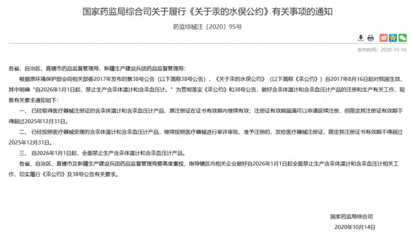 受理產品的處理:已經按照醫療器械受理的含汞體溫計和含汞血壓計產品,繼續按照醫療器械進行審評審批,準予注冊的,發給醫療器械注冊證,限定其注冊證書有效期不得超過2025年12月31日。