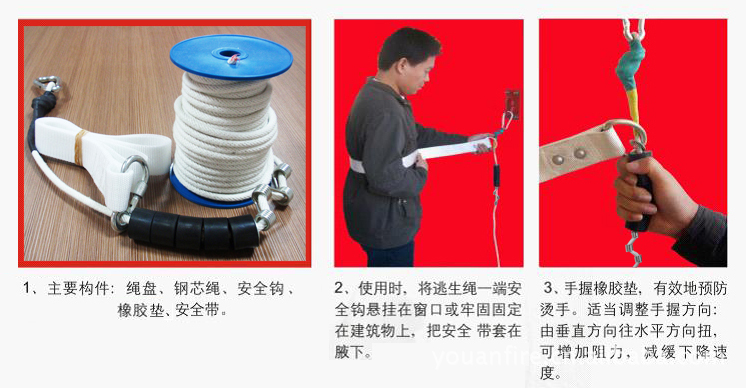 二、材質性能: 逃生繩內芯采用軍用航空鋼絲,外包由尼龍線編織而成,下降時中途遇到火情不易燒斷,依然可以自行緩慢下降,保證了逃生安全。