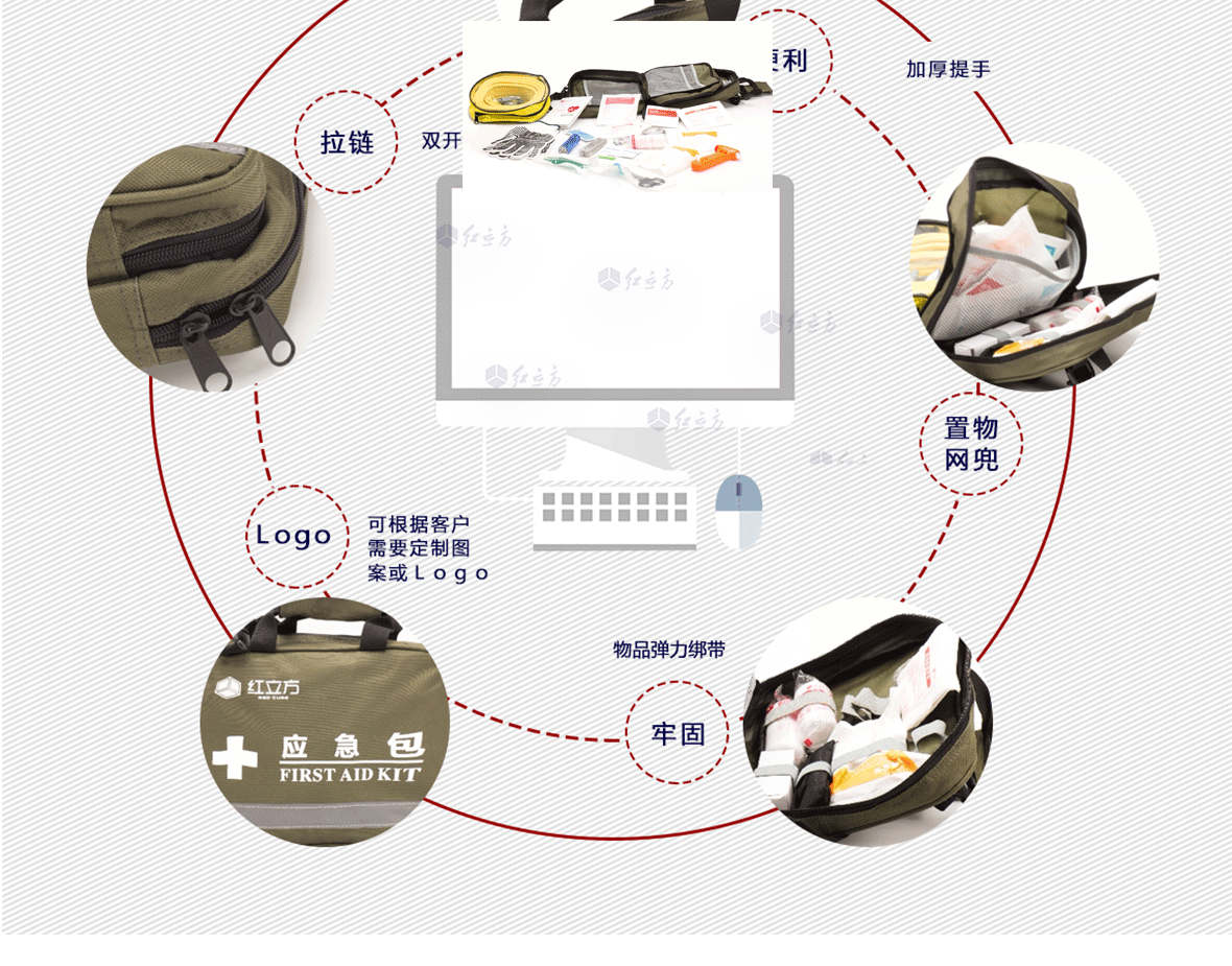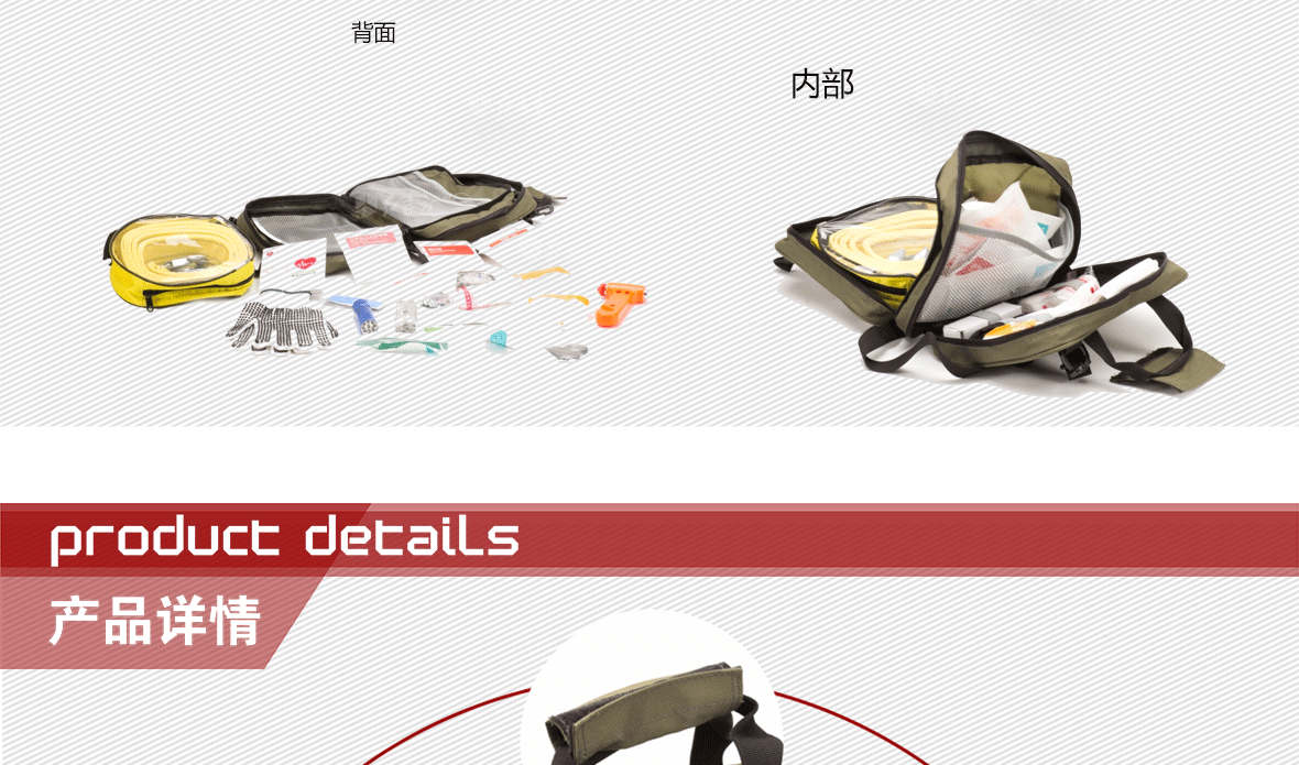 | 型號(hào):RCC-002車載標(biāo)準(zhǔn)型應(yīng)急包 | 外包:滌綸 | 顏色:紅、綠 | ||||||